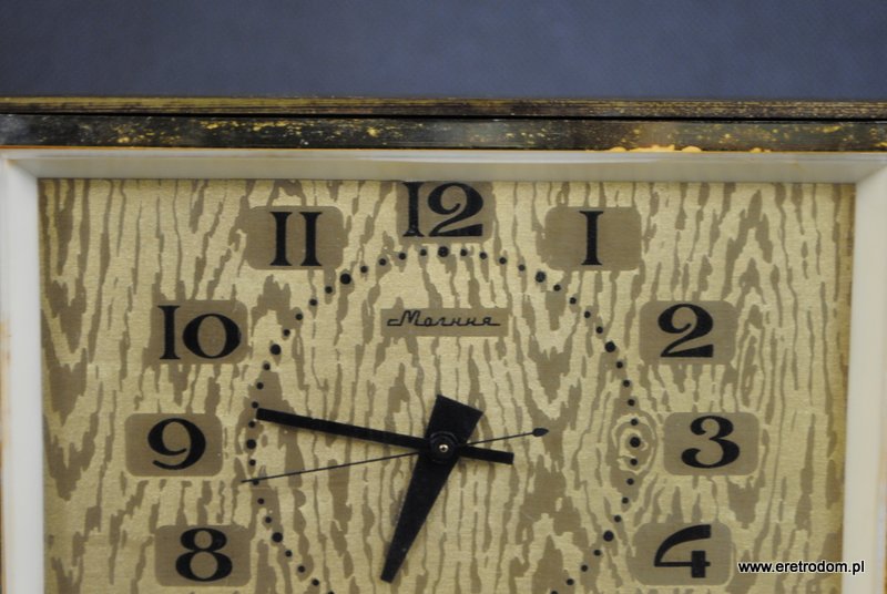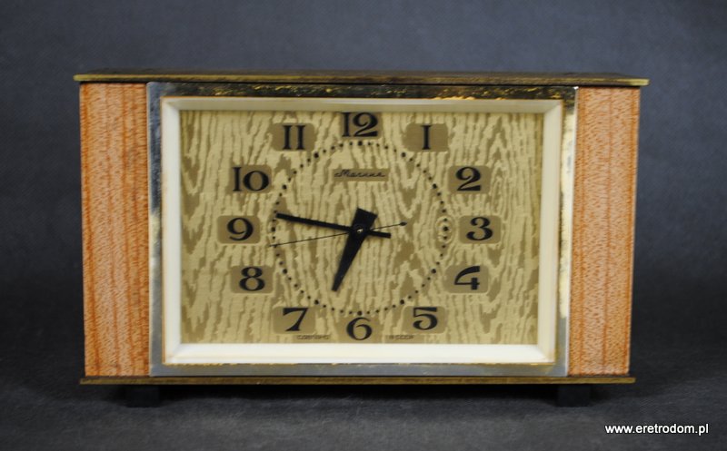 Radziecki budzik producent Mołnia, klasyczna budowa, drewno połączone z elementami mosiądzu.