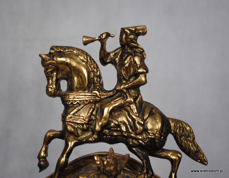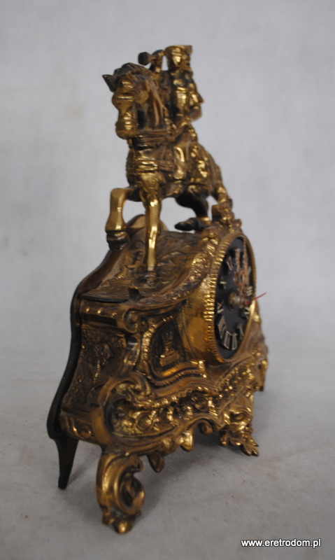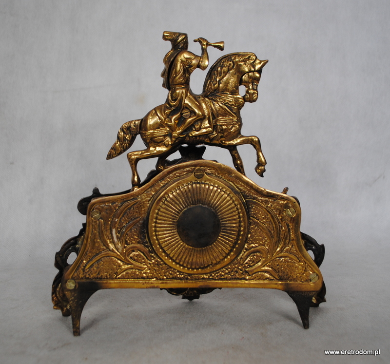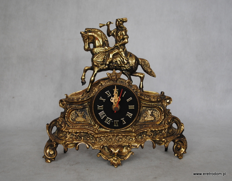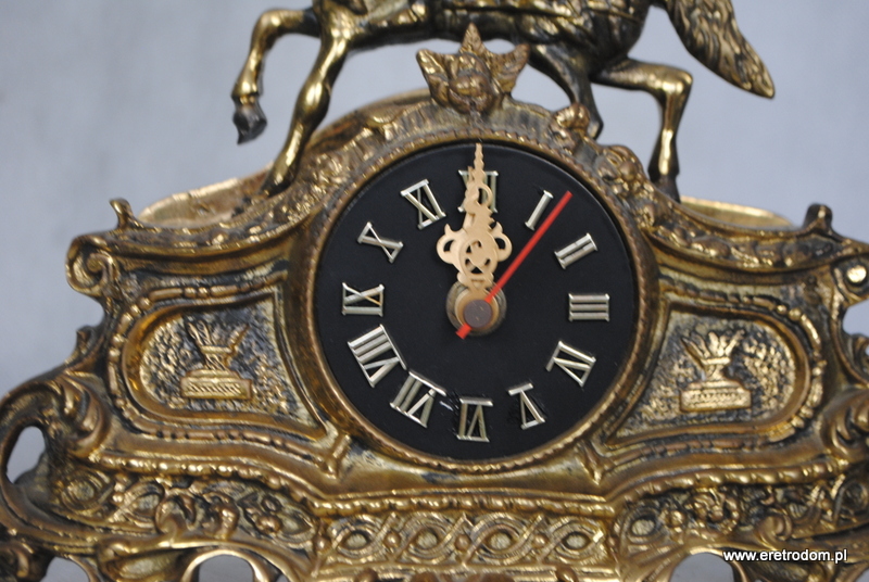 Strojny zegar figuralny. Wykonany w II poł. XXw. z mosiądzu, ciężki, solidny. Na baterie paluszki. Spawany.