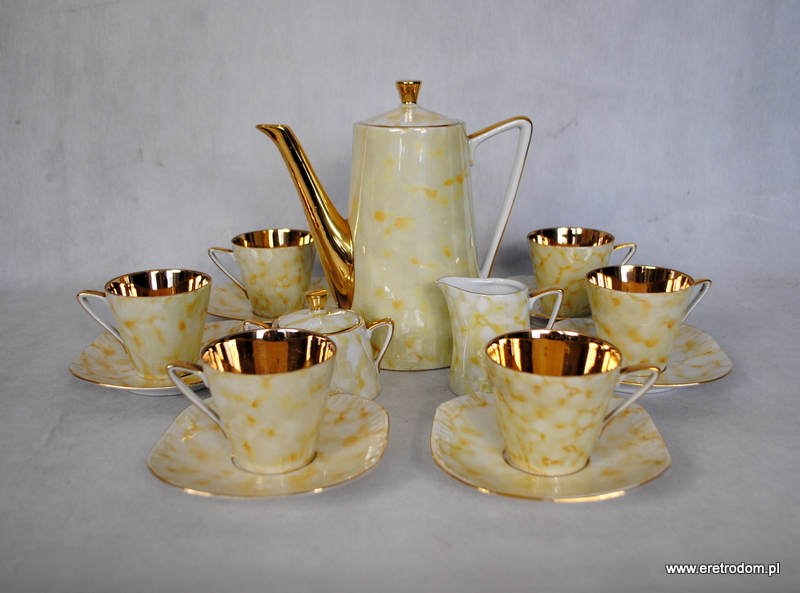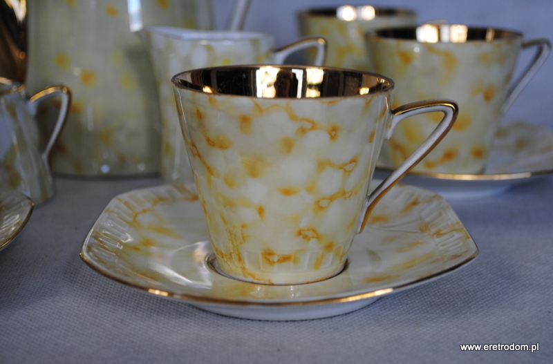 Zestaw dla 6 osób sygnowany Wawel, fason Millenium/ Helena, proj. Ruszczyński, lata 60. Biała porcelana zdobiona w prywatnej malarni tzw. „marmurkiem”. Filiżanki w środku złocone.