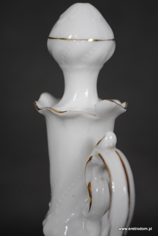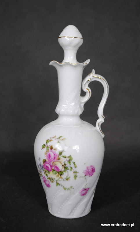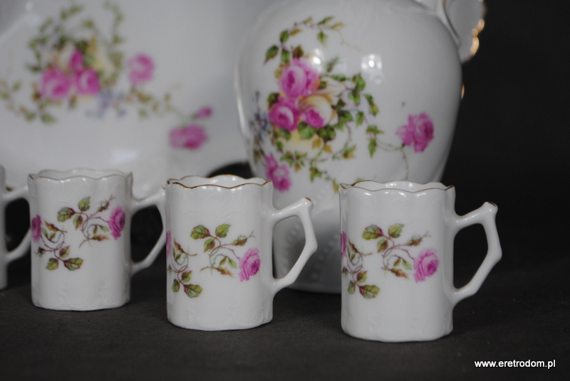 Zestaw do likieru wyprodukowany w II poł. XXw. Biała dość delikatna porcelana ozdobiona motywem różowych kwiatuszków, rant złocony. W skład zestawu wchodzi taca, karafka oraz 6 kubeczków.