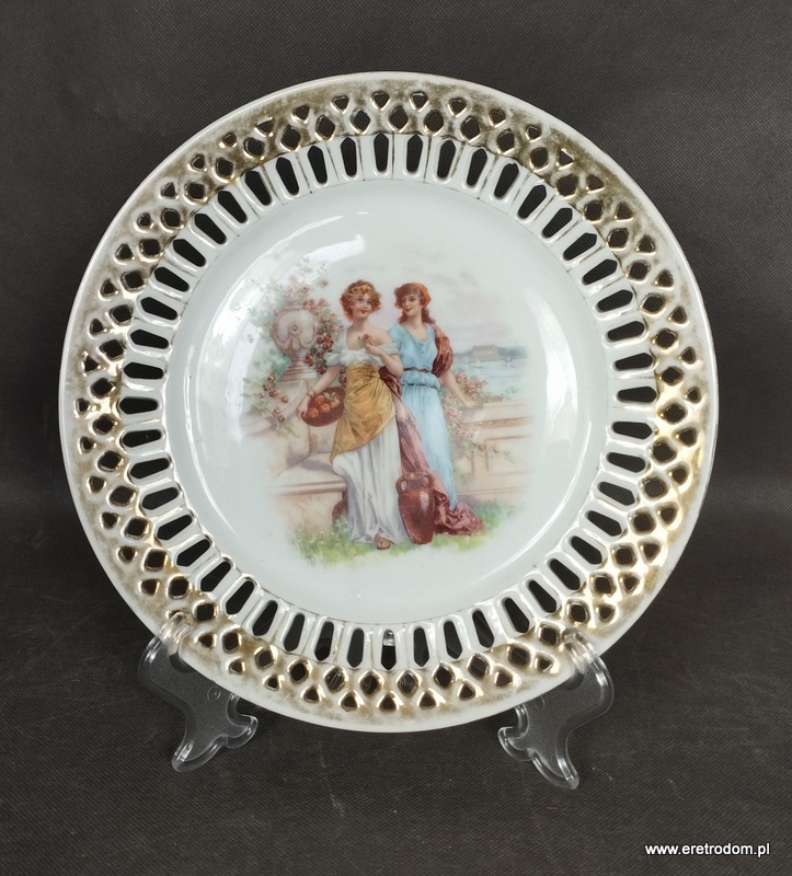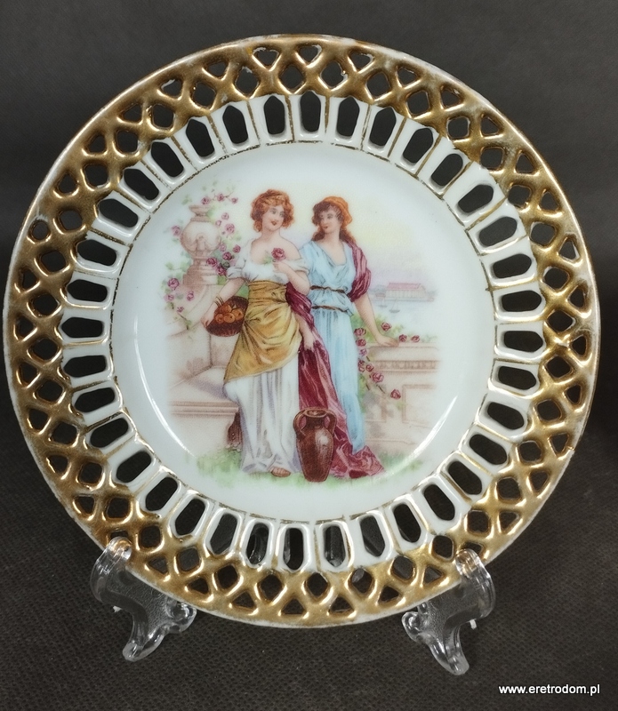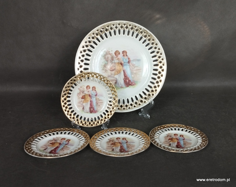 Zestaw talerzy do ciasta 4+1 (4 talerzyki deserowe i jedna patera na ciasto). Biała porcelana, rant ozdobiony ażurem, złocony. W centralnej części scenka rodzajowa. Od spodu sygnaturanumeryczna.